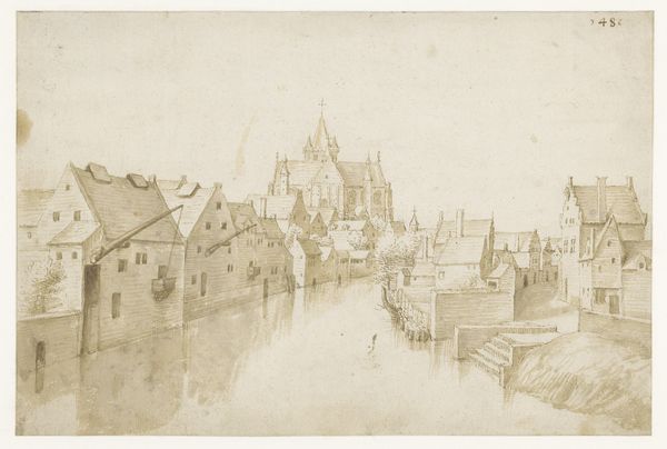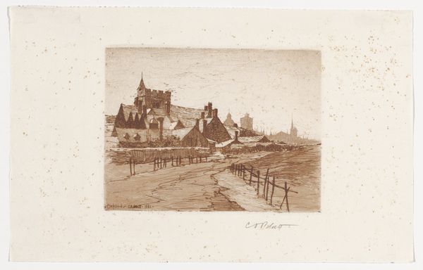 Curator: Well, doesn't that just whisper a story? Platt's 1883 etching, aptly titled "Oxford," has this quiet, dreamy quality. It's as if he's captured not just a place, but a feeling, you know? Like a memory half-faded but still holding onto its beauty. Editor: It strikes me as a very composed image. Note the eye-level vantage point which creates a specific type of perspective of the scene. Beyond being a cityscape rendered in ink, this etching reveals how nineteenth-century urban environments sought artistic representation and, thus, public validation. Curator: Yes! It's fascinating how Platt chose etching. It allows for that incredibly delicate line work. He uses all these layers and it creates such texture, doesn't it? Almost as though you could feel the rough stone, the weathered wood. What do you suppose attracted him to this particular view of Oxford? Editor: Platt belonged to a wave of American artists who, during that period, sought training in Europe. Prints such as this one depicting the Oxford cityscape underscore how, during the late 19th century, old European cities like Oxford came to embody history and learning but also served as symbols of the status that only artistic and cultural experiences could provide to elites. Curator: Exactly! You nailed it; they were drawn to it as an artistic ideal! What I also appreciate is the intimacy in the picture, I love how he found beauty and magic even in what looks like an unassuming street view. Editor: Absolutely. But, was the access to certain streets like this as free and unimpeded as it is rendered in this print? After all, cityscapes often presented utopian ideals, conveying specific types of civic messaging. Curator: That's a great point, it might be less literal documentation and more of an idealized version. Still, the craftsmanship speaks volumes! It feels timeless, in a way. Editor: And to consider it a timeless view makes it all the more telling of the hopes and social projection of the American intellectual class, at the turn of the century. Thanks for the fresh view. Curator: You as well! These prints are full of secrets.