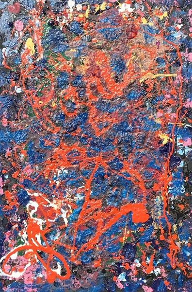 Jack Armstrong made this painting, Ancient Universal Royals, with paint on canvas. The way the colors drip and splash across the surface shows us that the making of this painting was as important as the final image. If you get up close, you’ll notice how the paint sits on the canvas. Some parts are thick, almost like frosting, while others are thin and runny. The red swirls kind of remind me of veins, like the painting has its own circulatory system. There’s a lot going on here, and I think that’s the point. It’s not about one thing, but about the energy of the whole. It reminds me a bit of action painting, like Pollock, where the gesture and movement become the subject, where the ambiguity makes the artwork resonate.