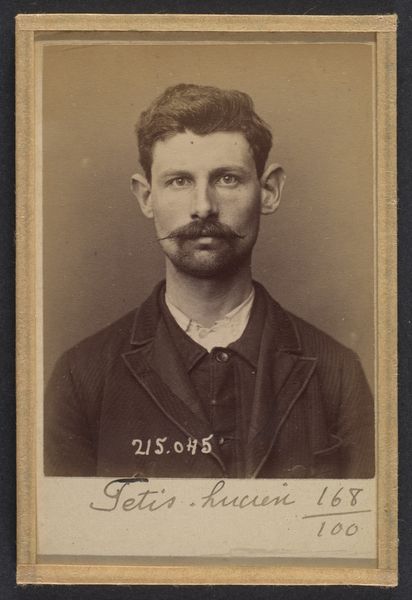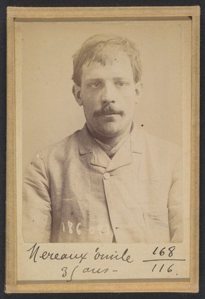 This albumen print, made by Alphonse Bertillon in 1894, shows us a man named Oscar Labrie. Bertillon was a French police officer and biometrics researcher, who pioneered the use of photography for criminal identification. The process itself is interesting. Albumen printing, popular in the 19th century, involved coating paper with egg white to create a glossy surface for the photographic emulsion. This demanded precision and skill, reflecting a shift towards standardized visual records. Here, the choice of albumen is significant. It was a cost-effective material that allowed for mass production, reflecting the growing need for a systematic approach to policing. The tonal range it produced is limited, resulting in a somewhat flat image, devoid of much character. It is the very antithesis of fine art photography. Consider the labor involved in producing such images, the repetitive actions required to create a series of near-identical images, and how this contrasts with the unique identities of those captured. By focusing on materials and processes, we can understand the complex ways in which photography played a role in the exercise of power.