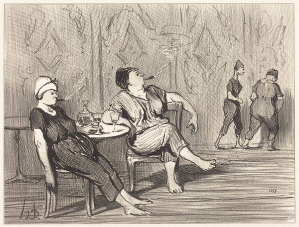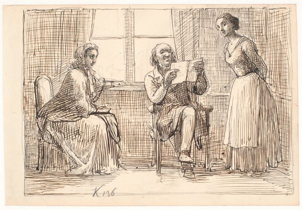 Wilhelm Marstrand created this pen and brown ink drawing, titled "A Gentleman Reads Aloud to Five Ladies", sometime in the mid-19th century. The composition is dominated by a semi-circle of figures. The gentleman on the left is juxtaposed against the attentive faces of the five ladies on the right. The artist has skillfully used line work to define form and texture. Note the hatching technique used to create shadow and volume on the clothing of the figures and the backdrop. The density of lines indicates shadow, creating a sense of depth. Marstrand uses line to construct a scene that speaks to both social interaction and the dynamics of representation itself. The act of reading, a form of conveying knowledge, is framed by the gazes of the women, thus creating a discourse on the reception and interpretation of information. The somewhat ambiguous and sketchy background flattens the space, creating a theatrical stage. This is where social roles are performed. Marstrand invites us to consider how art itself functions as a form of reading and interpretation.