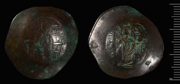 Curator: This is a Trachy of John III Vatatzes from Nikaia, currently residing in the Harvard Art Museums. Editor: The initial impact is one of profound wear and near illegibility, yet the forms strive for symbolic grandeur despite their diminished state. Curator: Indeed. Considering its materiality, the coin's eroded surface invites us to analyze the residual composition, noting the implied volume achieved through shallow relief. Editor: I’m immediately drawn to the iconography: the Emperor with his scepter symbolizes authority, and what appears to be Christ bestowing blessings suggests divine sanction. A powerful message of legitimacy. Curator: The distribution of figurative elements on the two sides presents a fascinating study in balance and spatial tension despite the physical damage. Editor: Ultimately, these enduring symbols offer us a window into the cultural and political climate of the Nikaian Empire. Curator: Precisely. Its survival as an object and a signifier speaks volumes about its cultural role.