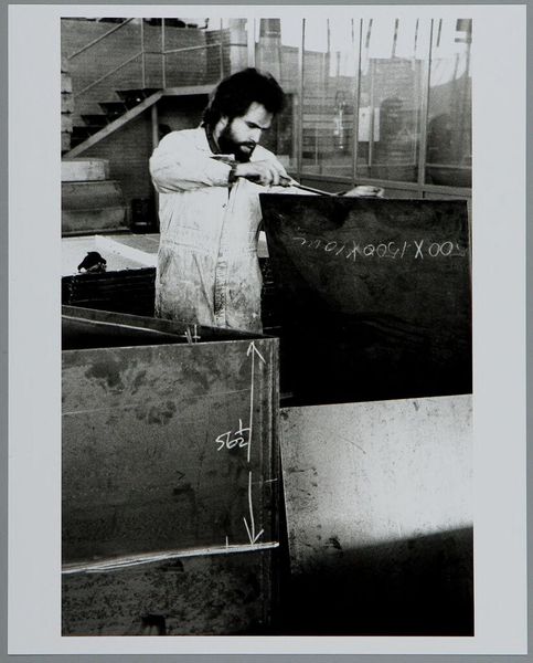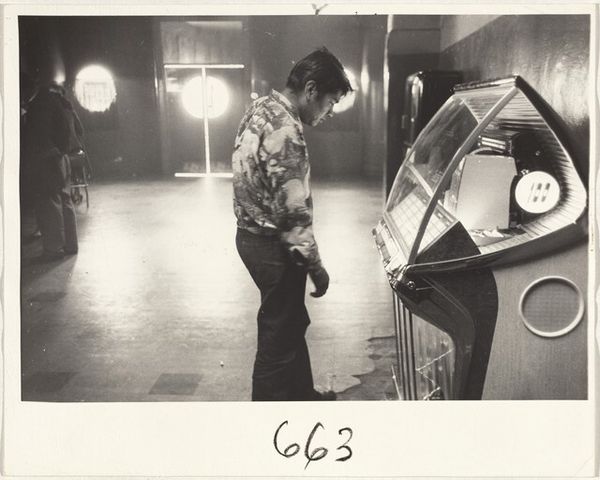 Editor: Here we have an undated, gelatin-silver print by Andy Warhol, called "Unidentified Man." It's a grainy black and white photograph. My eye keeps being drawn to the ski resting on the table. What do you see in this piece? Curator: I notice immediately the almost accidental composition. It's raw, immediate. Look how the ski intrudes into the space; the 'ROSSIGNOL' brand asserts itself, becoming almost a signature, or a signifier. It shares a graphic boldness with Warhol's pop art screenprints. The man himself, head bowed, absorbed in filling out forms – what meaning do these actions, repeated countless times, take on? Editor: It’s strange seeing a celebrity like Warhol take a seemingly mundane shot. What do the skis symbolize? Curator: Consider the cultural memory embedded in that ski brand. Rossignol represents not just recreation, but a lifestyle, a certain aspirational class. And here it sits amidst the mundane task of paperwork. Warhol was keenly aware of brands and the signals they project. He's reminding us that even in leisure, labour and obligation are present. Do you see a kind of contrast? Editor: Absolutely, there's the glamour of the ski slopes right next to these forms and the anonymous "Unidentified Man" filling them out. There's also something about how fleeting fame is, since no one recognizes Warhol enough to interrupt him for taking the photograph. Curator: Precisely. And that anonymity, it's a deliberate commentary, isn't it? The Unidentified Man performing his tasks while an artist observes, documents and shares to tell many untold stories about how people spend their time on and off ski hills. Perhaps fame lies not in being recognized, but in the universality of shared moments. What do you make of that idea? Editor: That's a good point. Warhol captures the idea of fame by observing these mundane symbols. Thank you.