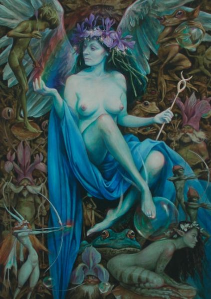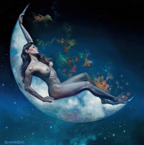 Editor: Here we have Boris Vallejo's 1984 oil painting, "Full Moon, Mystic Places of Dawn, Septic Flesh vinyl cover". It's… well, striking! There's a real sense of floating and almost ethereal fantasy to it. What's your interpretation of this work, focusing on how the piece is composed? Curator: Indeed. Considering this painting's intrinsic structure, one must note the deliberate interplay between light and shadow, establishing a visual hierarchy. The focal point, the embracing figures, benefits from strategic illumination against the darker, textured backdrop of the cloudy sky. Can you see how this creates depth and volume? Editor: Yes, it's as if the figures are emerging out of the darkness, spotlit by the moon. Is there anything particularly significant about their positioning in relation to one another and the moon? Curator: The composition utilizes the moon as both a backdrop and a compositional anchor, framing the figures. The entwined bodies demonstrate a visual balance. The contrast between the horned figure's muted tones and the vibrant red hair of the other contributes to visual dynamism. Editor: That’s interesting, that interplay is much clearer now! So the artist used color to achieve dynamic balance as much as visual depth. It all makes it so cohesive. Curator: Precisely. Further, the oil paint application itself is worth observing. Brushstrokes are relatively smooth on the figures, providing a sensual realism. In contrast, the brushwork in the cloudscapes is looser, gestural. This difference enhances the illusion of the scene. How do you feel all of this contribute to the fantasy mood you describe? Editor: It definitely adds to the dreamlike quality, like the figures exist in a different textural dimension from the clouds. Thanks for clarifying how the balance, depth and textures achieve cohesion and beauty within this erotic fantasy! Curator: My pleasure. It’s fascinating to note how the strategic manipulation of visual elements contributes to the construction of the artistic creation.