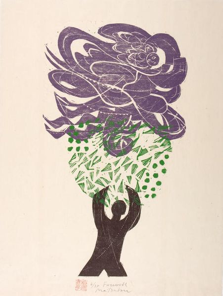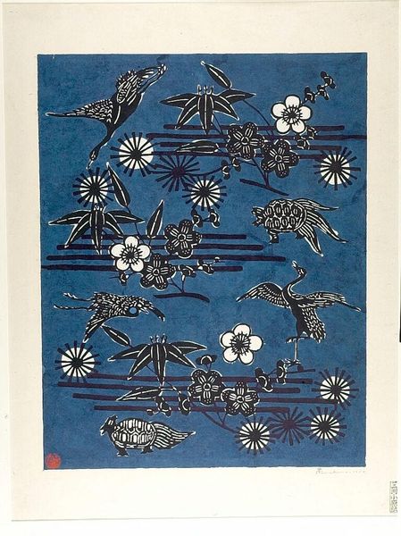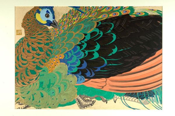 Curator: What a striking poster. This linocut print, "The Modern Poster," created by Will Bradley in 1895, exemplifies the burgeoning Art Nouveau style of the late 19th century. The poster served as an advertisement for Charles Scribner’s Sons, a publishing house in New York. Editor: It's incredibly graceful. The stylized peacock with its elaborate, flowing tail immediately grabs attention. I sense both elegance and a slightly melancholic mood evoked by the muted blues and the slightly desaturated off-white. Curator: That elegance was very deliberately constructed. Bradley, like other poster artists of the period, was acutely aware of the power of mass-produced images and their impact on public taste. The choice of a peacock, already loaded with symbolic associations of beauty and wealth, was no accident. Editor: Right, the peacock has so much history. In many cultures, it represents vanity and pride, but also immortality and renewal due to its molting and regrowth of feathers. Given it advertises "The Modern Poster", could its use here signal an audacious and vibrant future for the art form itself? Curator: That's insightful. It’s important to remember that this was a period where commercial art was starting to gain real recognition, but also drew some controversy. Using an aristocratic image for advertising was not entirely innocent. This could have subtly created distinction and allure for both the publisher and their featured product in a rapidly democratizing culture. Editor: You see how the peacock’s tail feathers seem to almost melt into each other, becoming an abstract pattern. This blending of recognizable imagery with near-abstract forms mirrors the core tensions of the era as new ideas collided with older beliefs and attitudes. Curator: Absolutely, it underscores the fascinating way that commercial art negotiated those tensions, often becoming a lightning rod for debates around mass culture, artistic authenticity, and class distinctions. Will Bradley would go on to have a successful career that blurred these lines as a prolific artist who did magazine illustration, typography, and even interior design. Editor: Thinking about that connection between art and commerce, it’s clear this peacock, with all its layered symbolism, was destined to capture the wandering eyes and imagination of potential customers. An exquisite image carefully calculated for an emerging cultural appetite! Curator: It really does offer a concise visual commentary on the changing social and economic landscapes of the turn of the century.