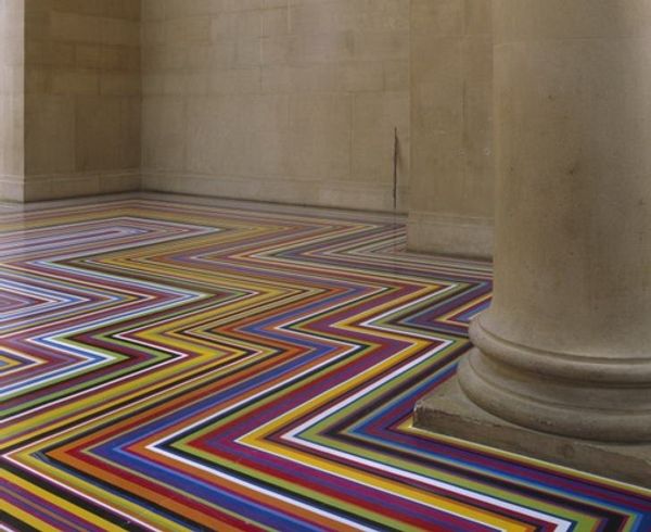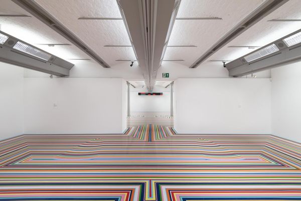 Editor: Here we have William Turnbull's 'Parallels', a painted wood sculpture. I'm immediately struck by its bold stripes and the way it sits directly on the floor. What do you see in this piece? Curator: The horizontal bands evoke a sense of landscape, perhaps referencing land and sky. Notice how the colors are divided; what emotions or memories do they trigger in you? Editor: I sense a feeling of stability, but also a separation. The colors seem to define separate spaces. Curator: Precisely. Turnbull is interested in how simple forms and colors resonate with universal experiences, creating a visual language that transcends cultures. Does that connection to the universal surprise you? Editor: It does! I hadn't considered the layers of symbolism beneath the surface. Curator: Often, the power of abstract art lies in its ability to evoke collective understanding through seemingly simple forms.
