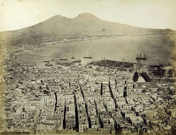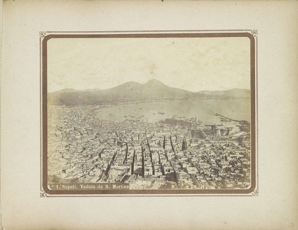 Curator: What strikes me most is the almost dreamlike stillness, given it's an albumen print capturing bustling Naples. There's a peculiar timelessness to it, even though it was snapped sometime between 1860 and 1880. Editor: Indeed! My initial impression is the sheer weight of history emanating from this image. The way the city spreads out, almost like an organism under the watchful gaze of Vesuvius, speaks volumes about the passage of time and human endeavor. Curator: I love how Amodio gives us this dramatic vista from the Charterhouse of San Martino. It's as if we are perched right there, sharing in the serenity that inspired poets and painters. What's particularly amazing, of course, is how street-photography techniques capture so much narrative and mood. Editor: Absolutely, there is a calculated juxtaposition between the geometry of urban structures and the undulating silhouette of the volcano. It creates a subtle tension—nature versus culture, chaos versus order. Even in this sepia tone, I feel the vibrancy that underpins all pictorial styles that point to narrative expression. Curator: It almost makes me question whether such views, though undoubtedly gorgeous, could capture daily life. Do you see symbols suggesting how common people might've experienced it? Or, does the photograph idealize more than anything else? Editor: That is what Amodio reveals so wonderfully. Every small fishing boat, every church, every little brick tells tales about ambition and toil—collective aspirations captured through a photographer's lens that blends history and mythology into a unified view. The city below mirrors human aspiration and potential for transcendence; therefore, Amodio uses these objects in photography to point toward themes about growth, potential, and timelessness, as well as themes about man versus nature, as previously expressed. Curator: This reminds me that maybe we shouldn’t box artworks into simple categories. Michele Amodio’s “View of Naples from the Charterhouse of San Martino” asks us to go beyond surface beauty, I would say, to question how it affects the collective soul of society, which, in itself, creates endless fascination. Editor: Precisely. And looking at its iconic structure lets me recognize that photography carries emotional meaning, and cultural weight throughout history as much today as it ever has before.