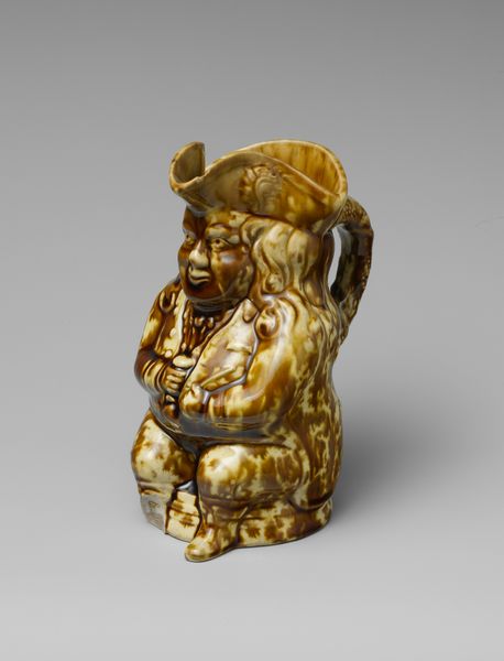 This Toby jug was made by the United States Pottery Company, which operated from 1852 onwards, using molded earthenware. The jug’s marbled effect is achieved through the combination of different colored clays, swirled together during the molding process. This technique, known as "agateware", mimics the appearance of natural stone, offering a veneer of luxury to a common material. The jug's production reflects a wider trend in 19th-century ceramics, where industrial techniques were used to create affordable and decorative objects for the growing middle class. The molded form allowed for relatively quick and easy replication, making these kinds of wares widely accessible. The design appropriates the folksy charm of a recognizable character, and the marbling elevates it beyond basic utility. By considering the processes and materials of this Toby jug, we can appreciate how it blurred the boundaries between mass production, artistic expression, and social aspiration.