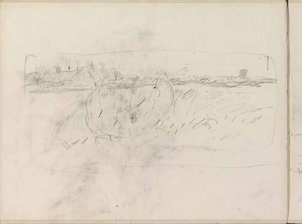 Editor: Here we have Georges Michel's "Montmartre van een grote afstand," created sometime between 1773 and 1843, a delicate pencil drawing. It feels very sparse and raw, almost unfinished. What stands out to you about it? Curator: Considering its materiality, notice the artist’s direct engagement with the landscape. The pencil, a relatively accessible and portable tool, allows for an immediate record of the observed. The “unfinished” quality you note underscores its nature as a study, revealing the labor and process behind Michel's landscapes. How do you think its status as a drawing rather than a finished painting impacts its value? Editor: That's a good question! Does it make us appreciate the artist’s skill more, seeing the bare bones of the composition? The ephemeral nature of pencil makes it feel…humbler, maybe. Curator: Exactly! It disrupts the traditional hierarchy of art forms. Oil painting, often associated with wealth and permanence, versus drawing, typically seen as preparatory. Michel's choice elevates the everyday landscape and the immediate act of sketching, democratizing the artistic process. We might ask ourselves: who had access to this view of Montmartre, and who was afforded the leisure to depict it? Editor: So, you're saying the medium itself challenges the social order somewhat? By using simple materials, he's also drawing attention to a landscape accessible to many. Curator: Precisely. The rough quality speaks volumes. It acknowledges labor, the artist's, certainly, but also the implied labor shaping the landscape itself, a landscape viewed not from aristocratic privilege but perhaps from the perspective of those who toiled within it. Editor: I never would have considered the pencil as making a statement about art and class! Thank you, it’s truly interesting to consider art this way. Curator: Indeed, thinking about the means of production, access, and the labor inherent in artmaking reveals so much about an artwork's cultural and social context.