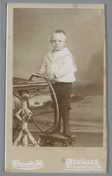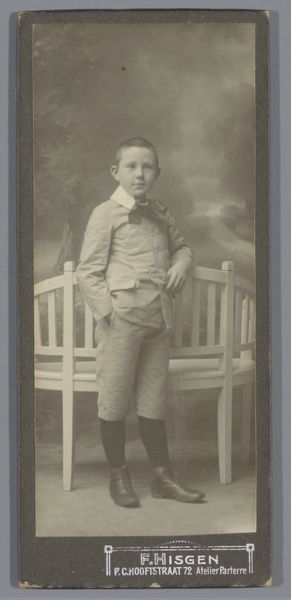 Idanus Hendrikus Slaterus created this small portrait of an unknown boy, capturing a moment in time with the photographic techniques of his era. Slaterus, who lived through a period of vast social change, shows us a glimpse into the life of a young boy, likely from the Dutch middle class. The boy stands in a suit with a serious expression and fashionable boots. The conventions of portraiture at the time tended to favor posed, formal settings, yet there's something about the boy’s gaze that feels both vulnerable and defiant. The image offers insight into the construction of childhood and class identity in the late 19th century. As we consider the context, we might ask ourselves: What expectations were placed on this young boy as he grew into manhood? What hopes did his family have for him? This photograph encapsulates the intersection of personal identity and broader societal norms.