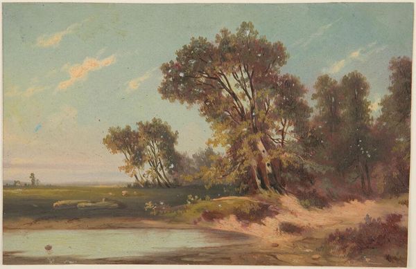 Editor: This is Volodymyr Orlovsky's "Landscape with River in Ukraine", an oil painting. There's a definite stillness to it; it feels very much like a captured moment. How do you read this landscape? Curator: What strikes me is how this "stillness" you mention isn’t simply a quiet scene. Landscape painting, especially in 19th century Eastern Europe, was deeply intertwined with national identity and the construction of "place". Can we really separate the idyllic scene from the political realities and social tensions inherent in Ukraine’s history, its very claims of nationhood? Editor: I hadn’t thought of it like that, it just looked like a pretty scene. Curator: Exactly! It’s easy to get lost in the aesthetic beauty, but who is allowed to experience this beauty? Whose labor is absent from this idealized landscape? What’s deliberately being omitted to create this seemingly objective representation of Ukrainian "nature"? Consider land ownership, serfdom, the evolving role of the peasantry - these weren’t separate from the landscape, they shaped it. The artist's choices – what to include, what to exclude – those are inherently political. Editor: So, the very act of painting this scene is a statement, even if it appears apolitical? Curator: Precisely. The focus on a harmonious, rural scene can function as a powerful, yet subtle, endorsement of a particular vision of national identity and, more insidiously, national purity. It's crucial to ask: whose vision is being presented? Whose voices are missing? Editor: I’m starting to see landscapes in a whole new light. This has really changed how I’ll look at these kinds of paintings in the future. Curator: Hopefully, this prompts you to examine the socio-political forces inherent in seemingly passive artwork! The image becomes a text that reflects power dynamics.