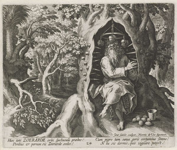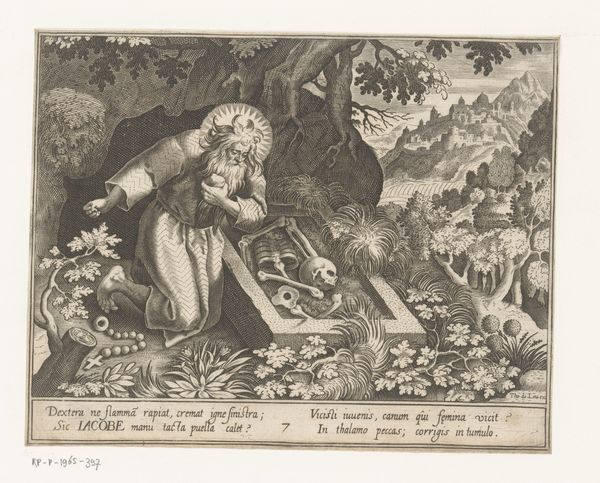 Johann Sadeler’s engraving from the late 16th century presents us with Jacob, the hermit, amidst symbols of mortality and contemplation. Dominating the scene is the stark memento mori—a skeleton in a tomb—reflecting the transience of life and the inevitability of death, a common theme in the hermit’s meditations. But consider this motif’s journey. From ancient Roman sarcophagi, where death masks and skeletal figures warned against hubris, to the danse macabre in medieval art, these symbols weave a narrative across time. The skull, a potent emblem of death, echoes in Hamlet’s soliloquy, prompting reflection on existence and the afterlife. Here, Jacob’s contemplation engages the viewer in this timeless dialogue. The rosary beads further connect this image to the cycle of life, death, and spiritual rebirth, embodying a powerful, collective unconscious. Like the serpent in ancient mythologies, shedding its skin to be reborn, the symbols in this engraving demonstrate a non-linear, cyclical progression. The same imagery resurfaces, evolves, and takes on new meanings, echoing through history and engaging us on a deep, subconscious level.