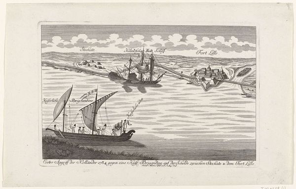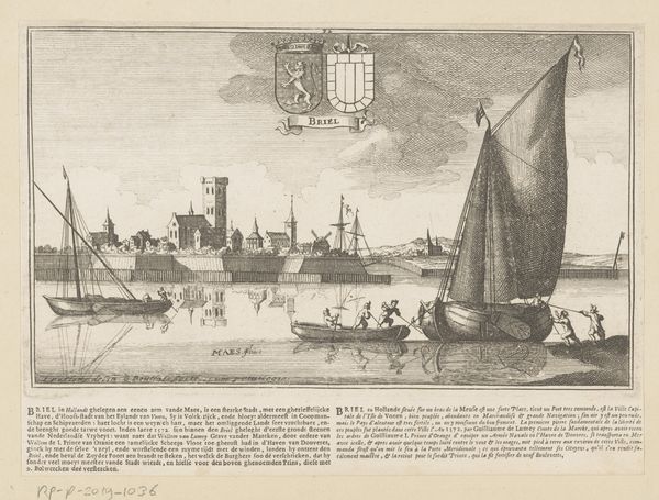 Editor: We’re looking at “Gezicht op Muiden,” an etching and engraving by Gaspar Bouttats from 1679, currently held in the Rijksmuseum. It's quite detailed and reminds me of maps, especially the way the text frames the image. How do you interpret this work? Curator: Indeed! This isn’t just a landscape; it’s a symbolic representation of Muiden itself. The text is an integral part, acting almost as a key to decode the visual imagery. Do you notice the prominent placement of the city's coat of arms right at the top? It serves as a kind of declaration. Editor: Yes, the coat of arms is hard to miss! But what exactly does it declare? Is it a straightforward depiction of the town's geography and status? Curator: It does more than depict. The composition and symbols emphasize Muiden’s strength, resilience and identity. The sailboats signal connection to waterways and trade, suggesting a prosperous town defined by exchange. Notice how the buildings aren’t just randomly placed; they highlight civic and religious structures, indicating community and order. This isn't just seeing; it’s about *reading* an image. Editor: So it’s like a visual resume for the town? Emphasizing the qualities they wanted to project. I never considered how much intentional communication could be packed into an etching like this. Curator: Exactly! It reminds us how deeply intertwined visual representation and civic identity were, and how art served as a powerful form of communication. Now, consider other cityscapes from the Dutch Golden Age... What patterns do you observe? Editor: That's fascinating! It makes me see these historical prints in a whole new light. They’re not just pretty pictures; they're carefully constructed narratives. Curator: Precisely! And the layers of cultural memory embedded in them continue to resonate.
