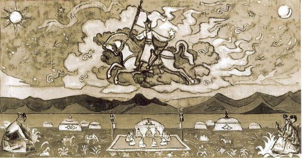 Nicholas Roerich, painted "Great rider. Rigden Jyepo - Messenger of Shambhala," sometime in the 20th century, probably using tempera. The first thing you notice is the way Roerich layers the colours, one on top of another, building this shimmering effect, almost like he is making marks on silk. Look closely and you'll see how he uses the materiality of the paint to create this incredible atmosphere and a sense of visual depth. There's this great orange horse rearing up through clouds that are rendered like swirls of cream. The whole composition is full of movement and energy. It's like he’s trying to capture a feeling more than a literal representation. It reminds me of Hilma af Klint, but with a totally different cultural inflection. Ultimately, the painting is about the possibilities of mark making, and how even a simple gesture can evoke something profound. Art is a conversation, and Roerich had something important to say.