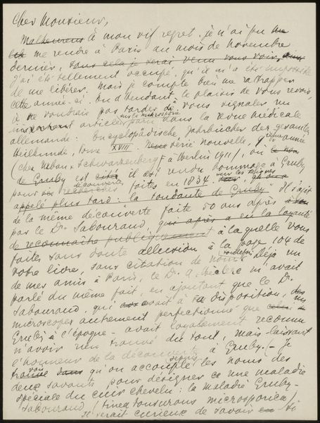 Curator: This is "Brief aan Jan Veth" by Richard Nicolaüs Roland Holst, likely created sometime between 1923 and 1929. It's currently held at the Rijksmuseum. As you can see, the piece consists of pen and ink on paper. Editor: My first impression? It feels… intimate, like a stolen glimpse into a personal moment. It has a wonderful handmade quality to it. It’s small, domestic. I find it rather comforting. Curator: Yes, that sense of intimacy comes across strongly. The letter is, after all, a private correspondence, now on public display. Roland Holst adopts an Intimist style in his drawing, offering a rare, candid glimpse of someone significant in his life, maybe Jan Veth himself? The paper itself seems aged, bearing the traces of its production. The handwriting is faint in places, contributing to the delicacy and the aged mood of the piece. Editor: Looking closer, the material itself—the ink, the paper—speaks volumes about the period and Roland Holst's creative choices. Was this commonplace materials, or carefully selected, imported stock? This penmanship itself required skill and, what was the value then placed on handwriting, on receiving personal letters at the time this was produced? The materiality infuses it with history. Curator: That's an excellent point. Roland Holst worked a lot with social and political themes in his wider body of work and his medium often complimented his subject matter, and the intended receiver. But the letter seems to have transcended its immediate purpose of communication to become an artifact—a testimony of intimate relations and to the cultural values associated with writing letters in the 1920's. I also imagine there are things only the recipient would have understood about what the artist alludes to here... Editor: Exactly. We look at the aesthetic qualities but in a way it’s a piece produced using accessible and functional materials, like labor, penmanship, or the sending or receiving of personal correspondence might be more accessible concepts too. Curator: Absolutely. Its quiet beauty whispers of something bigger. Thank you, this has provided for me too some renewed insights into an artwork I had studied before. Editor: Indeed, it is more than just ink on paper, and I hope the audience enjoys this snapshot of a person’s private inner life made tangible.