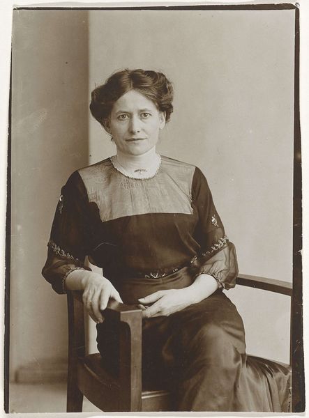 Curator: This is an untitled photograph by Martin Schweig, now part of the Harvard Art Museums' collection. Editor: The sepia tones give it such a dreamy, almost melancholic feel. It reminds me of a faded memory. Curator: The portrait style itself, with the seated woman and the props around her—the fireplace, the statue in the background—echoes a classic symbol of domesticity and status from that era. Editor: Status, yes, but also constraint, maybe? The woman's gaze feels a bit…resigned. Curator: Perhaps. Or it could be a symbol of quiet strength. After all, portraiture was often about projecting an image of power and control. Think of the cultural connotations: a woman, poised, contained, the mistress of her domain, immortalized. Editor: I like that. It's definitely more empowering than my first impression! It makes you think about what the photographer wanted to communicate and maybe also what she herself wanted to show. Curator: Absolutely. It layers meaning onto what might seem at first glance like a simple portrait.