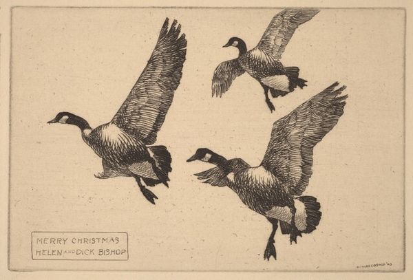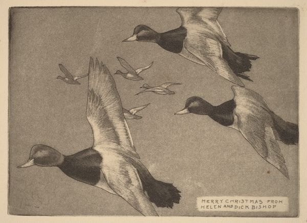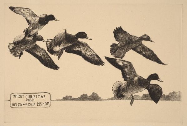 Editor: This is a Christmas card etching from 1945 by Richard Evett Bishop, titled "Christmas Card from Helen and Dick Bishop." I’m immediately struck by its simplicity and the hopeful feeling evoked by the birds in flight, considering the context of that time period. What do you find most compelling about this piece, especially from a historical perspective? Curator: It's intriguing to consider this work within the socio-political landscape of 1945, the final year of World War II. This card speaks volumes about the yearning for peace and normalcy during and after the war, where imagery of nature often symbolizes hope and return to prosperity. Birds in flight, in particular, resonate as symbols of freedom. The decision to create a hand-made card rather than a mass produced one also implies a longing for personal connection in a time of upheaval and detachment, when many people were separated from family. Does this reading resonate with you? Editor: That absolutely makes sense. It adds a layer of depth that I hadn't considered initially. The act of sending a personalized card does speak to connection and perhaps even resistance against the dehumanizing effects of war. Does the Bishop’s artistic style tie into a larger movement or trend? Curator: Bishop's focus on wildlife reflects a broader interest in naturalism, and landscape art prominent in that era. The choice of etching as a medium, enabling multiples, indicates that artists could create "original" works that were also more accessible than painting to a wider audience. This aligns with a movement towards democratizing art and circulating imagery that promotes particular values – in this case, perhaps peace and familial bonds. What's your take on how art serves a public role during times of conflict and recovery? Editor: I see your point; it becomes a visual touchstone for shared values and aspirations. Looking at it that way, this simple card becomes quite powerful. Curator: Exactly! It’s a subtle yet potent example of how art intersects with and shapes social consciousness. We often underestimate the quiet, domestic artifacts when investigating those historical narratives. Editor: This has really changed how I view something as seemingly simple as a Christmas card. I'll definitely be looking at art with a more critical eye towards its historical and social context from now on.
