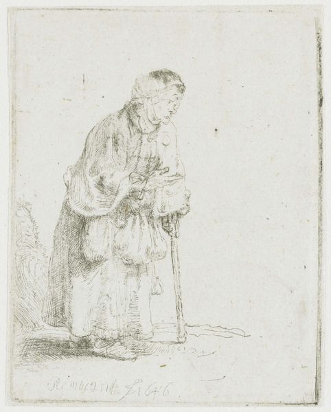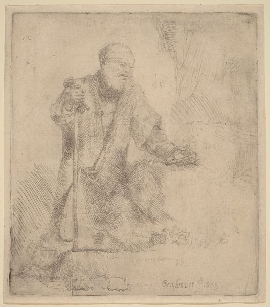 Editor: Here we have Rembrandt van Rijn's "St. Peter in Penitence," an etching from 1645. The lines are so delicate, it looks almost like a charcoal drawing. There’s a quiet sadness to the figure. What stands out to you about this piece? Curator: What strikes me is the relationship between the etched line and the portrayed subject. Etching, a process involving acid to bite into the metal, was becoming more widespread. Consider how this repeatable process allows Rembrandt to create a supposedly "unique" artwork to a wider market. Does the shift in accessibility diminish the spiritual experience? Editor: That's a really interesting question! I guess I hadn't thought about the relationship between the means of production and the message. Do you see that playing out specifically in how Rembrandt rendered St. Peter? Curator: Absolutely. Observe the clothing, how it seems almost like a woven material. This print, then, shows class differences because printed matter and clothing are goods consumed unequally by distinct classes. How does the availability and consumption of religious imagery affect individual interpretations of faith and moral culpability? Editor: So, you're saying the act of mass production affects the consumption of religious imagery and its meaning? Curator: Precisely. And Rembrandt, through his mastery of the etching process, blurs the lines between art as a devotional object and art as a commodity, raising crucial questions about access, value, and belief in the 17th century. Editor: That makes me think about how differently people experienced art then, compared to now, where images are so readily available. Thank you; that really changed my perspective. Curator: My pleasure. Considering the materials and their cultural context often enriches our appreciation and unearths profound questions about the society that produced the art.