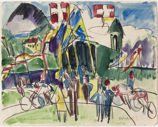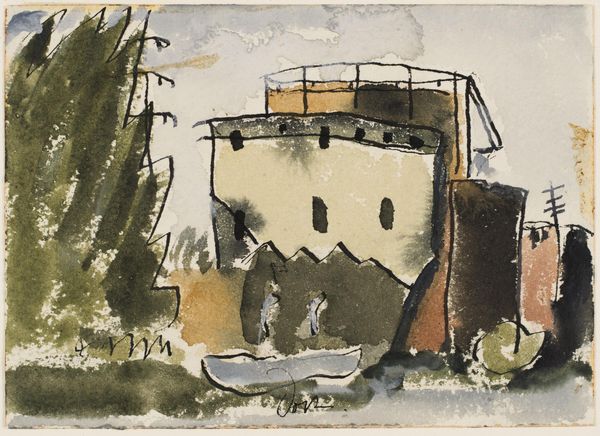 Ludwig Bemelmans created 'Capri Piazza, Sketch for "Italian Holiday"' using watercolor, pen and ink. The sketch presents a lively piazza scene, composed with fluid lines and transparent washes of color. Bemelmans uses color sparingly, yet effectively, to define shapes and suggest depth. Note the tower in the background, sketched with simple lines and pale washes, standing in contrast to the bolder, more saturated hues of the foreground. The composition is structured to draw your eye from the loosely defined background elements to the animated figures and vintage cars in the foreground, creating a dynamic sense of movement and energy. The sketch’s open form, with its unfinished quality, invites us to consider the interplay between representation and abstraction. Bemelmans captures the essence of a bustling Italian square, playing with line and color to evoke the spirit of a place through suggestion rather than precise detail. It’s a vibrant example of how a sketch can convey the atmosphere of a scene through the artist's selective use of form.