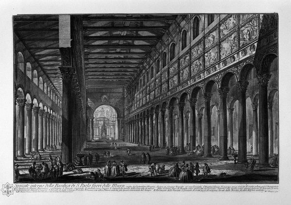 Curator: Here we have an engraving by Giovanni Battista Piranesi, titled "View of the Basilica of St. Maria Maggiore and the two factories side of that Basilica". The black and white print captures an interior perspective of the Basilica. Editor: My first impression is of infinite space, a receding tunnel of shadows and monumental architecture. The detail is dizzying! Almost overwhelms the small clusters of people scattered about. Curator: Piranesi was fascinated by Roman architecture and his prints often explore the grandeur and complexity of these structures. Consider the social and political implications. Architecture of this magnitude served to solidify the Church's power and inspire awe. Editor: Oh, definitely awe! And perhaps a touch of intimidation. The strict lines and perfect perspective make me feel like I am peering into a carefully constructed dream. Almost too perfect to be real, don’t you think? There’s a drama there, a curated performance of power, indeed! Curator: Absolutely. It also showcases Piranesi's skill as a printmaker. The intricate linework brings out both light and shadows. This reflects the architectural style but also reinforces those institutional values of hierarchy and order so central to Baroque sensibilities. Editor: Right, but there is more! Look at how Piranesi balances detail and simplicity! And then again look at the minute details and perspective, this space is unreal. It makes one's head spin! It certainly sparks ideas... What might it feel like to dance through this cavernous hall, completely alone, the only witness to its grand scale? Curator: That imaginative connection you make highlights an important point – art can inspire, but it also needs interpretation through socio-political frameworks to fully understand its purpose. Editor: Perhaps that’s where the fun lies— bouncing between the “what” and the “why” like echoes in this great hall! Curator: Indeed. Piranesi's work exemplifies that dynamic beautifully. Editor: Leaving me happily lost between history and imagination, as always.