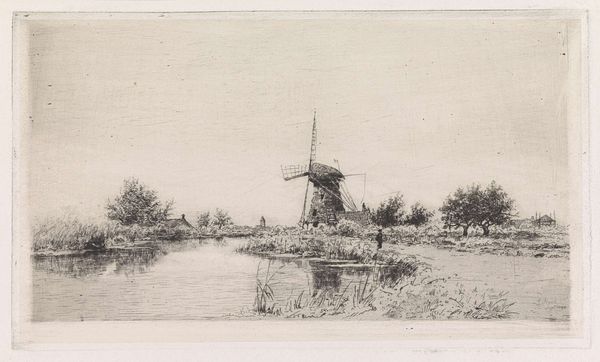 Elias Stark created this landscape with windmills and a rowboat using etching, a printmaking technique. Stark, born in Amsterdam, lived through a time of significant industrial advancement that transformed the Dutch landscape. The etching captures a serene scene of windmills alongside waterways, reflecting the Netherlands' complex relationship with water and land reclamation. Windmills, historically crucial for drainage, became symbols of Dutch resilience and ingenuity. In the image, you can see the figures of the people who are working on and around the mills, giving a sense of how vital they were to the local economy. The lone rowboat suggests themes of individual experience within the broader context of environmental control and economic activity. The artist seems to present an idyllic vision, which may not tell the full story of the ecological changes which took place at this time. It's a scene that invites us to consider our place in the landscape and our ongoing efforts to shape the world around us.