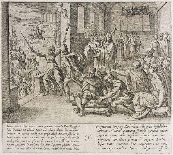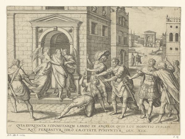 Pieter Jalhea Furnius created this print, "De farao laat het koren opslaan voor de zeven magere jaren," in the late 16th or early 17th century. Observe the intricate network of lines forming the image, directing our eyes through scenes of labor and architecture. Figures strain under the weight of sacks, their forms rendered with cross-hatching that gives volume and texture. In the foreground, contrasted with the workers, are two standing figures whose calm and still presence are a striking contrast. Furnius employs a sophisticated semiotic system. The architectural elements—sturdy buildings and imposing archways—symbolize order and control, framing the industrious activity within. The figures, caught in dynamic poses, represent labor, each action and reaction is carefully rendered in the composition. This piece is not merely representational; it’s an exploration of structural oppositions. The artist uses the print to explore power dynamics and the value of work, inviting us to interpret its structured forms through a lens of social and philosophical ideas.