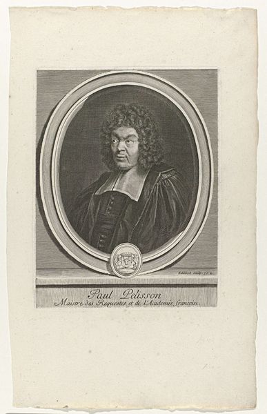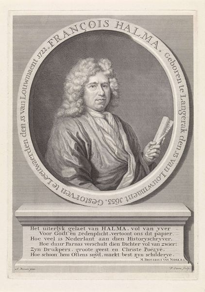 Isaac Ledeboer created this portrait of Ernst Jan Ledeboer using engraving techniques, capturing a sense of composed dignity. The oval frame, inscribed with the sitter's name, immediately directs our focus to the figure within. Ledeboer's mastery of line is evident in the detailed rendering of textures. Notice how the lines create a sense of depth, particularly in the drapery and the subject's hair. The contrasting light and shadow further enhance the three-dimensionality of the form, pulling the figure forward. The composition is structured around balance, with the subject centrally located, yet there is a slight asymmetry in the gaze and hand gesture. This asymmetry introduces a dynamic quality, preventing the portrait from feeling static. The inclusion of the inscription below adds another layer, merging visual and textual elements in a manner typical of the period. It invites us to consider the artwork's role in constructing and conveying meaning, through both image and text.
