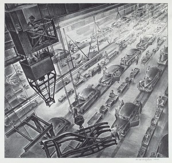 This is John Gutmann’s “Elevator Garage, Chicago”, a gelatin silver print. It’s hard to pinpoint exactly when it was made, but it captures a moment, a way of seeing the urban landscape as this mechanical, almost surreal structure. What strikes me here is the texture – or lack of it. Gutmann plays with light to flatten the forms of these cars. You see the way the chrome details catch the light, but the bodies are mostly dark, blending into the industrial architecture of the elevator itself. It's a study in contrasts: the smooth curves of the cars against the rigid geometry of the building. Look at how the perspective is skewed, making the elevator seem to stretch endlessly upward. The repetition of the cars creates a visual rhythm, a kind of mechanical ballet. It reminds me a bit of Bernd and Hilla Becher’s typologies, that deadpan documentation of industrial forms. But Gutmann brings a sense of humor, a slightly off-kilter perspective. He doesn't just document, he interprets, he plays. It's like a futuristic vision viewed through a slightly cracked lens.
