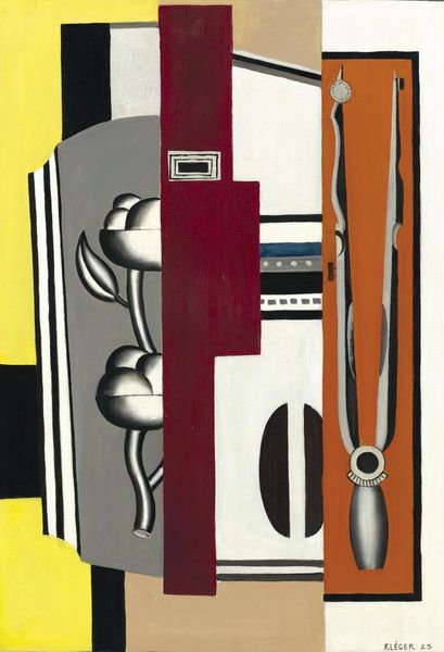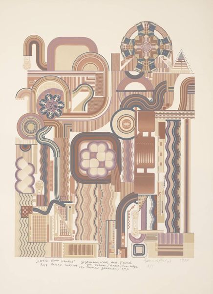 Curator: Eduardo Paolozzi's screenprint, "Four Stills from the History of Nothing," presents us with a vibrant, almost chaotic collage of mechanical and geometric forms. Editor: My first impression is organised chaos. It feels like a blueprint for something, but I can't quite tell what. Is it a machine, or some strange kind of marketplace? Curator: The image, created by Paolozzi in 1973, layers imagery associated with technology and consumerism. Consider the political dimensions of representing machinery alongside consumer goods. Are we critiquing the relationship between the two? Editor: The mechanical valve structures, for instance, are juxtaposed with what look like price tags or inventory markers, drawing connections between industrial production and commodification. What kind of labour went into both? Curator: Exactly. And the juxtaposition of these elements creates a dialogue about the role of technology within social and economic structures, a commentary on progress and its potential pitfalls. Editor: It does make me wonder about access and power, who benefits from these machines. But it seems like the artist is also interested in the way industry and commerce shape our culture. Curator: Indeed. This piece offers a lens through which we might reconsider the historical and cultural forces shaping our modern world. Editor: A fascinatingly busy, but ultimately thoughtful, work. It speaks volumes about the society that produced it, and still does.