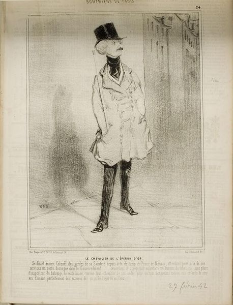 Editor: Here we have Paul Gavarni's "The Monday", an undated lithograph at the Harvard Art Museums. He seems a bit forlorn, standing there with the suggestion of a landscape behind him. What can you tell me about what's going on here? Curator: Notice how Gavarni uses the figure's posture—hands on hips, head slightly bowed. This stance, repeated across centuries, often signals weariness or defiance. Consider the inscription: "Jour de friture…" – "Day of fried food…" It hints at a specific cultural ritual, perhaps a Monday indulgence after a weekend. How does that change your perception of his posture? Editor: So, it's not just sadness, but maybe a humorous commentary on overindulgence? I didn't catch that at first. Curator: Precisely. It's about linking visual cues with cultural context. Images carry layers of meaning that shift over time. Now, consider the modern resonance of "Monday" and what it means to people today. Editor: That's fascinating! I’ll never look at Mondays the same way again. Curator: Nor will I. Each viewing reveals something new about cultural memory.