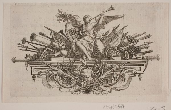 Curator: Here we have a striking engraving by Jacob Gottlieb Thelot, dating from about 1745 to 1755. It's titled "Design for a Rocaille Cartouche with the Figure of Justitia." Editor: The composition feels dense, almost suffocating. The level of ornamentation is incredible, isn't it? The sheer amount of labor that must have gone into this... Curator: Absolutely. Thelot was working during the height of the Rococo period, and that exuberance is evident here. These cartouches, often featuring allegorical figures, were incredibly popular as decorative elements within architecture and interior design. It reflected an era of ornate social life. Editor: Look at how Justitia, with her scales and sword, is almost bursting out of that swirling, shell-like frame. There is a real tension between the symbolic weight she carries and the lightness of the decorative elements surrounding her. It feels intentional, no? What statement is that labor of line work meant to create? Curator: Indeed. The contrast highlights the role of justice within society—as both a foundational element and an ideal elevated through artistry. These engravings were not just artworks but models, intended for workshops and artisans to reproduce and adapt for larger-scale projects. Editor: So, these prints almost function as early prototypes, demonstrating a sort of design intent to craftspeople? Curator: Precisely! And the inclusion of a cherubic figure on the left side hints at the divine endorsement of justice itself. But you are right; the materials, like the engraving itself, reveal a network of production and distribution, playing a key role in shaping aesthetic tastes across Europe. Editor: It's fascinating to consider how these engravings were used and re-used. From a single design object came potentially infinite applications, changing contexts with different purposes, which is really the core of craft. Curator: Thinking about the dissemination of design ideas, these allegorical cartouches played a role in shaping visual culture. And in today's society, allegorical art such as this still speaks to audiences who search it out. Editor: Well, this engraving opens up a way for us to contemplate how the social function of design relies so deeply on materials and making, in the past, and still today.