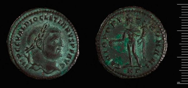 Editor: Here we have the "Follis of Diocletian, Antioch," a coin made during Diocletian's reign. It's small, but the imagery is really striking despite the wear. What can you tell me about its place in the bigger picture? Curator: This coin provides insight into how Diocletian used imagery to solidify his power. The coin itself served as propaganda, circulating his likeness and reinforcing his authority throughout the empire. Notice the iconography; who is depicted on each side, and what message does that send? Editor: On one side is Diocletian himself, and on the other, a figure who seems to be holding a globe. I guess the message is that he rules the world? Curator: Precisely. And consider the context: Diocletian reformed the Roman government, establishing the tetrarchy. So this coin, in its imagery and circulation, was a tool for shaping public perception of this new political order. Does that shift your understanding of its purpose? Editor: It does. It’s not just money, it's a message, shaping how people saw the emperor and his power. Thanks!