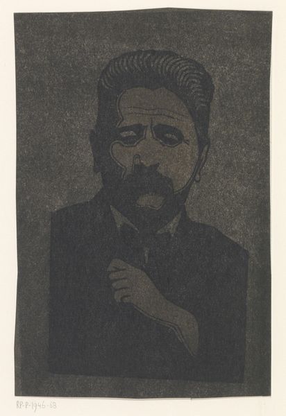 Curator: Samuel Jessurun de Mesquita created this woodcut, "Self-Portrait with Hand on Moustache," in 1917. The print exemplifies his style, sitting at the intersection of portraiture and expressionism. What springs to mind for you when you first look at this work? Editor: Intriguing! The first word that jumps out is "brooding," even with that fantastic moustache practically begging to be twirled. He looks caught between a smirk and deep thought. It makes me want to know what was going through his head when he created it. Curator: It's interesting that you see that internal tension. Considering the historical moment—1917, amidst the devastation of World War I, with the rise of anxieties regarding modern identity—perhaps that 'brooding' quality speaks to a broader societal feeling. Mesquita, as a Jewish artist in Europe at the time, would have been especially attuned to rising xenophobia and the fracturing of social bonds. Editor: Absolutely, and that sharp contrast inherent in the woodcut technique only accentuates it. I mean, there is zero subtlety—it's all hard edges, literally carving out the nuances of his inner life for the viewer. The lines on the face feel deeply etched—both in the block, and figuratively onto his character. Curator: Yes, the stark contrast highlights the psychological intensity, something he clearly shares with other expressionist artists of the time, who really used those hard lines to capture the anxiety and disillusionment that defines modernity. Editor: Looking closer, it is really moving to see how the detail is focused on the face. Everything else – his suit, even his hair – falls secondary. All those lines converging onto his gaze! Almost a dare, I think. Curator: I concur with your sentiment regarding that intensity. The gaze does feel confrontational. The intersectional approach—viewing the work through the lens of historical, social, and identity-related elements—reveals layers of significance. Editor: I leave seeing an intimate and courageous act, one that somehow manages to reflect its particular moment and speak volumes about the endurance and strength of the human spirit in moments of conflict. Curator: I find myself rethinking art's potential as a form of resistance. It underscores the role of marginalized identities as sources of immense creativity, challenging prevailing systems of power.