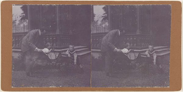 Editor: This is a photographic work by William Herman Rau, circa 1898, titled "Generaal Fitzhugh Lee, kapitein Charles Dwight Sigsbee en kapitein A. J. Iverson aan boord van de USS Fern"—or "General Fitzhugh Lee, Captain Charles Dwight Sigsbee, and Captain A. J. Iverson on board the USS Fern." The composition, with the men posing rather stiffly, almost gives a sense of restrained authority. How would you interpret this piece? Curator: Note the deliberate arrangement of the figures. Observe the strong horizontal lines formed by the seating and the subjects’ poses; these lines ground the image. Note also the verticality introduced by the standing figure in the back. Rau’s employment of light—its source, angle, and tone—sculpts the subjects' faces, adding texture. Does this careful ordering and the distribution of tonal value not emphasize the formal relationships? Editor: I see what you mean. The limited tonal range does unify the whole composition. And those lines… but it almost feels *too* composed. Was that typical for portrait photography of the period? Curator: The constraint lies within the medium, does it not? Photography during that era lacked dynamism. A longer exposure was required, influencing subjects to pose solemnly, in stillness, because the technological possibilities were not yet fully explored. Note also the stereo card format, which affects how we perceive space. What impact do you perceive? Editor: That makes sense. Now I see how the photographic method itself—its limitations, its inherent characteristics—shaped not just the appearance but even the atmosphere of the photograph. Curator: Precisely! By recognizing these formal considerations, we can then discern their connection and meaning within this still life. These structural components grant a more holistic image of the piece. Editor: That's helpful, I hadn’t considered how technology limits the creative output of artists, especially in its infancy!