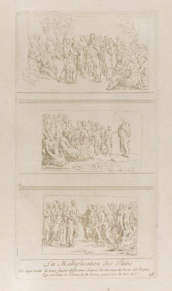 Editor: Here we have "Figures before an Altar," a drawing/print by Bernard Picart, sometime between 1685 and 1733. The figures have such a sense of stillness and classical grace. What do you make of it? Curator: Well, the overall tone reminds me of those bittersweet moments in Greek tragedies—a certain somber beauty clinging to the precipice of disaster. Do you see how Picart uses line to create such a delicate, almost fragile atmosphere? The scene has such order. I see it as an imagined representation of an ancient ritual. It could just as easily depict ladies quietly heading off for tea. Editor: Ritual is an interesting observation. The figures almost seem suspended between movement and complete stasis, especially with their mournful faces. Is it the subject, do you think, or is there something else giving it that air? Curator: It's a potent combination, don’t you think? Look how the draping of the fabrics emphasizes their shapes. Picart isn't merely depicting a scene, he's creating a stage. He wants us to contemplate their humanity, their grief. We should ask ourselves what sacrifices were required back then? The altar symbolizes this. Do we sacrifice now, too? Editor: I see what you mean about staging and contemplating their emotions. I hadn’t really picked up on that before! Curator: Precisely. Now you have found a piece of history with which you are having a conversation. And isn't that grand?