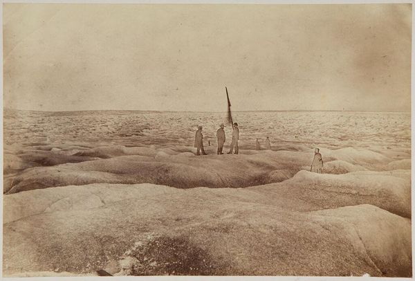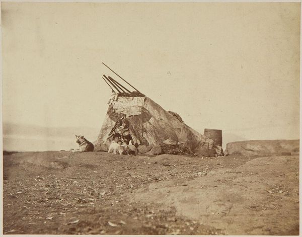Curator: What strikes me first is the desolation. It's just...endless, isn't it? Editor: Indeed. What we're looking at is an albumen silver print held at the Harvard Art Museums, aptly titled "Jansen the dog driver" by John L. Dunmore. It's a scene of stark survival. Curator: Survival, yes, but also a strange beauty. That pale light, almost bleached. The dogs look exhausted, yet alert. It’s like a dream, a memory of a place I've never been. Editor: The dogs arranged on the snow-covered ground are fascinating symbols of domestication and adaptation. They represent the symbiotic relationship between humans and animals in extreme environments. Their posture almost reads like heraldry. Curator: Heraldry in the snow. I love that. It makes me wonder about the stories this photograph holds, unwritten, in the silence of that landscape. Each dog a character in an epic we'll never know. Editor: The scene is a tableau of perseverance, really. The driver, the dogs, the sled—they’re all elements in a portrait of endurance that whispers across time. Curator: Perhaps that's the true artistry of this photo; it whispers stories instead of shouting them. Makes you want to listen closer, doesn’t it?
