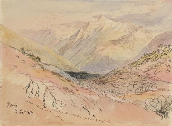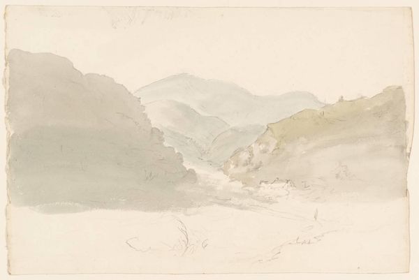 Editor: Here we have J.M.W. Turner's "View in the St. Gotthard Pass, Switzerland," created in 1842 with watercolor. It feels expansive and isolating at the same time. How do you interpret this work? Curator: Turner's landscapes are never simply landscapes. The Gotthard Pass itself is a potent symbol. What do mountains mean to us? Editor: Strength, resilience, timelessness, I suppose. Obstacles? Curator: Precisely. Mountains, like the sea for Turner, represented the sublime – a confrontation with nature's power that both awes and terrifies. The pass is not just a geographical location, but a passageway, a threshold. Think of it as a liminal space between states of being. What imagery comes to mind? Editor: Something epic. A pilgrimage? The lone traveler braving the elements? Curator: Yes, and perhaps the spiritual journey is just as arduous as the physical one. Notice how the washes of color – the blues and browns – bleed into one another, blurring the distinctions. Is this only about nature's splendor or the mind encountering something so vast that distinctions become lost? This piece reveals cultural memory through nature, in all its symbolic complexity. Editor: So it's not just a pretty landscape. It’s about human psychology in relationship to this powerful landmark. The way the mountain blends into the sky almost makes it divine, right? Curator: Precisely! Do you think you see echoes of Romanticism within the representation? Editor: Definitely, and I understand how Turner’s interest in Romanticism infuses a traditional landscape with human symbolism. I will certainly look at landscapes differently from now on!