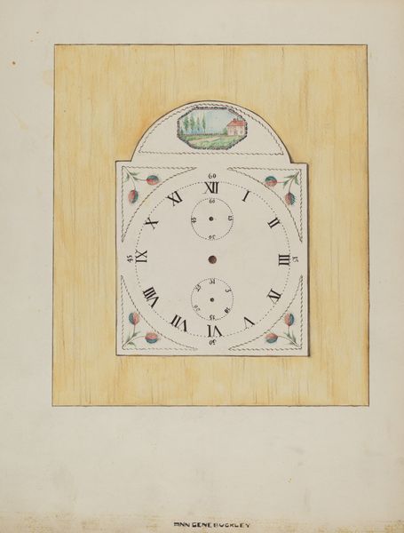 Editor: Here we have Lawrence Phillips’ “Clock,” created around 1936 using colored pencils. The level of detail is impressive! I am struck by the way it feels so still, despite depicting something that's supposed to measure the passing of time. What can you tell us about this artwork? Curator: Considering its time of creation, we might view this work through the lens of the Works Progress Administration, a New Deal agency that employed artists to create visual records of American design and culture. Does this context alter how you perceive the artwork? Editor: That's interesting! So, it’s less about the clock itself and more about documenting it as a specific object from a specific era. I suppose it makes sense since many artists at the time depicted industrial subjects. But how does that connect with something as domestic as a clock? Curator: It suggests the artist or the agency considered it culturally significant, perhaps representing middle-class values of order and punctuality during a period of immense economic instability. We also have to consider the influence that art and architecture from prior generations has over the current socio-economic moment, or lack thereof. Did you pick up on the fact that it's a pendulum clock with a rather antique design, despite being created in the 1930s? What do you make of the artistic choices used by the artist? Editor: That is something I had noticed, yes, but I hadn’t fully considered its influence over socio-economic stability in that era. I like the color scheme though; there’s warmth. It isn’t necessarily an outstanding piece, but I appreciate what Phillips and the WPA were trying to achieve here. I wonder if there were some inherent biases when curating pieces such as these in order to give a particular impression of the socioeconomic background of the era... Curator: I think it would be interesting to explore exactly that. There may be quite a fascinating dissertation topic hiding here, and there’s always value in further interrogation of archival resources and biases when exploring any art period.. Thanks for this thoughtful discussion!