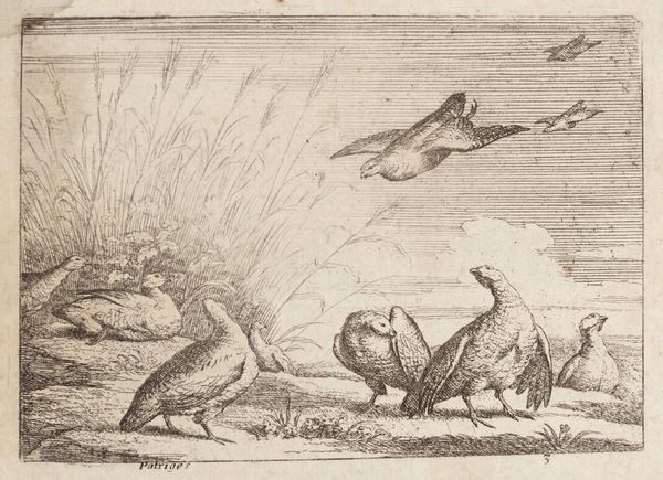 Editor: This is Francis Barlow's print depicting various birds, it's teeming with life! It's a lively scene, but there's also an element of predator versus prey. What can you tell us about its place within the context of art history? Curator: It is fascinating how Barlow brings the life of birds in detailed environments! Prints like these became increasingly popular as they democratized access to natural history. What do you think about the implied power dynamics depicted? Editor: Well, the cormorant swallowing the fish is pretty striking. It’s nature as both beautiful and brutal. Curator: Exactly! Barlow presents the natural world as both a source of wonder and a theater of conflict, reflecting evolving attitudes toward nature and its relationship with human society in the 17th century. Editor: That’s given me a lot to think about regarding how we perceive and portray the natural world. Curator: It challenges the viewer to consider their place within this grand narrative, doesn't it?