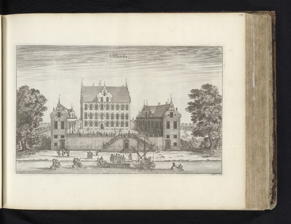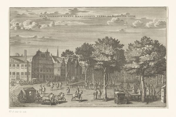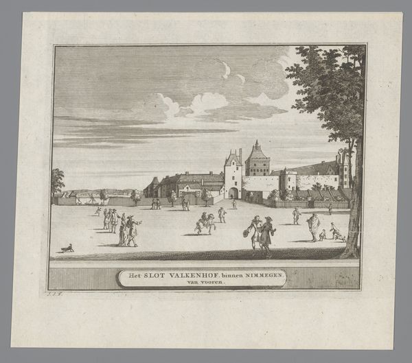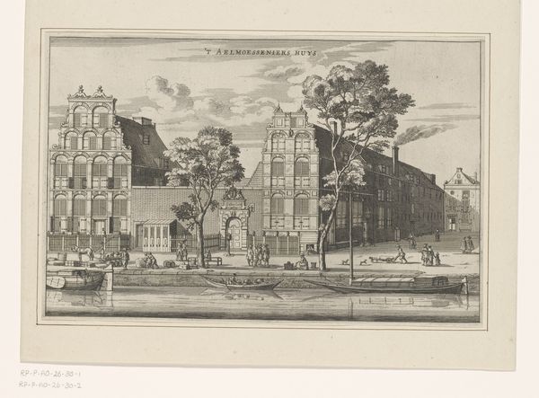 Curator: Here we have an etching from 1693 entitled "Gezicht op het Leprozenhuis te Amsterdam," which translates to "View of the Leper House in Amsterdam." It's currently held at the Rijksmuseum. Editor: Immediately, I’m struck by the overwhelming sense of isolation. Despite the presence of figures, the atmosphere feels intensely somber and detached, as if a veil separates them from the viewer. The composition almost emphasizes that through the framing effect of the architecture itself. Curator: I notice that the use of line, particularly in the trees and buildings, creates a strong sense of perspective, drawing the eye into the space of the courtyard. The precision of the engraving highlights architectural detail, particularly the rhythm of the arches and fenestration. Editor: And consider the context! Leper houses, or lazarettos, were sites of social exclusion and marginalization. The print depicts the relationship between health and social standing, offering a visual statement on 17th-century attitudes toward illness and difference. Each figure seems suspended, caught in a moment between diagnosis and community exclusion. Curator: The artist employs a delicate balance of light and shadow, wouldn't you say? This effect sculpts forms and also creates spatial depth in the etching, notice how they rendered this by using darker shading to indicate depth behind forms? The tonal range here is quite impressive, particularly given the graphic medium. Editor: Definitely. And what does that shadowing accomplish? It hints at something hidden beneath the surface of this scene. Those shadowed spaces aren't merely aesthetic flourishes but indicators of hidden pain, suffering, the deliberate 'othering' that constructs these isolated spaces. I think what strikes me is how relevant the idea of systemic exclusion remains today. Curator: Certainly. Although I find the etching's balanced composition and clear lines particularly compelling. The formal organization of the pictorial space leads to interesting intellectual interpretations. Editor: Absolutely, and situating that organization within the societal ills that are mirrored there only serves to illuminate this historical space’s continuing presence in modern issues of discrimination. Curator: A most poignant thought.