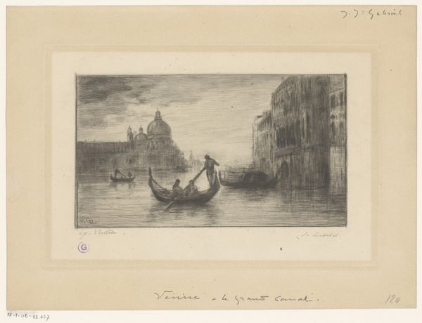Curator: Ah, this is a rather captivating print; an etching actually. Entitled "Canal Grande, Venetië" by Etienne Bosch, it’s believed to have been created sometime before 1931. Editor: Moody, isn't it? A real chiaroscuro thing going on. The sky presses down, almost mirroring the water. Like a city holding its breath. Curator: Yes, the contrast is quite dramatic, typical of Venetian painting and harking back to the Baroque style. Consider the socio-political weight Venice carried; this print would have circulated within a Europe still clinging to ideals of the Grand Tour. Editor: True, the Grand Tour...every posh young thing had to float down the Grand Canal, didn’t they? I wonder what Bosch was really feeling. Beyond the "Venice is pretty" postcard view, there's something unsettled. Look at the scratchy lines, the almost frantic detail in the Basilica di Santa Maria della Salute. Curator: Interesting. I’m looking more at the figures – anonymous, dwarfed by the architecture, rendered as ghostly as the palazzi themselves. The Church, literally looming. Perhaps it's a meditation on the decline of Venetian power? A commentary on its gilded cage? Editor: Could be. Or maybe he was just cold and wet on a Tuesday morning! The lone gondolier though, he feels symbolic somehow. Piloting through history, always looking backwards, toward the familiar. And the light, clinging to the edges of the dome. Gives it a defiant kind of beauty. Curator: An excellent point. The way that light catches – consider the role that light has in the imagery around power. It's worth considering this within art history’s construction of Venice – its symbolic import, even now. Editor: Right, you get the sense that the whole place might just slip beneath the waves at any moment. Romantic and melancholy. I dig it. Curator: It certainly leaves you with something to consider. Editor: Indeed, makes you want to hop on a gondola and ponder the cosmos... or just find a nice espresso.
