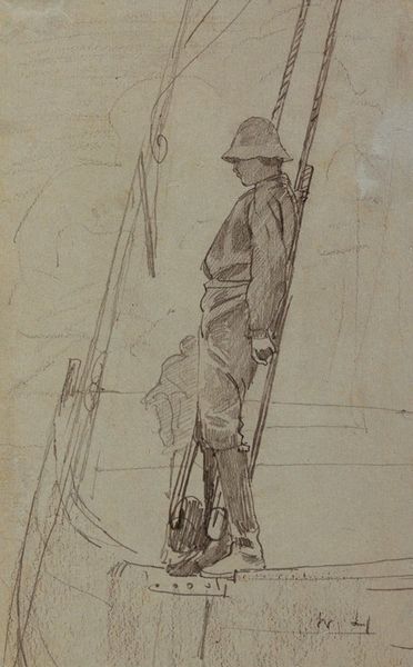 Editor: So, this drawing, "Boerenjongen zittend op een kruiwagen" by August Allebé from 1853, is deceptively simple. It looks like a quick sketch, but the boy's gaze is quite intense. What strikes you most when you look at it? Curator: You know, it's funny, I see that intensity too. Almost as if he's daring you to underestimate him. It reminds me of growing up in the countryside – that silent, watchful presence kids sometimes have, absorbing everything. It’s also fascinating how Allebé captures such a detailed likeness with such spare, economic lines. Did he plan this drawing in advance, or did he spontaneously compose it? I'm leaning toward the latter; what about you? Editor: I think you might be right – it feels spontaneous, almost like a snapshot. But, beyond the boy's expression, I find myself drawn to the composition itself. How Allebé uses the wheelbarrow to frame him is really interesting. Curator: Exactly! It elevates an everyday scene. It isn’t just a boy on a wheelbarrow; it's a boy *becoming* part of the landscape, connected to the very tools that define his world. Makes you wonder what he’s dreaming about, doesn’t it? Escaping that wheelbarrow, maybe, or mastering it? Editor: I hadn't thought about that, his connection to the landscape. I just saw him as a subject, but your interpretation gives it more depth. It’s no longer a simple sketch, is it? Curator: Never! Sketches are seldom about capturing just what's *there,* darling. They’re about capturing what *could be*. Thanks to your perspective, I also see how Allebé makes this little scene iconic. Editor: Well, thank *you* for turning my perspective. Now, if you don’t mind, I want to keep dreaming along with this boy.