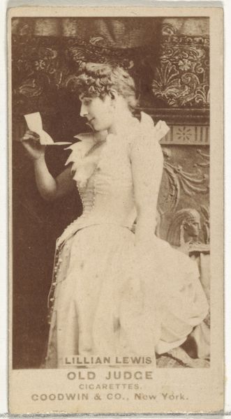 Curator: This small albumen-print card is from a series of promotional cards issued by Allen & Ginter, between 1885 and 1891, for their Virginia Brights Cigarettes, titled "Actors and Actresses." It depicts Sadie Cortelyou, an actress of the period. Editor: There's something ghostly about this portrait, despite its being linked to something as mundane as cigarettes. The sepia tone lends an antique feel, and the slight blurring makes Sadie seem to almost float on the surface of the card. Curator: Exactly! This kind of celebrity image fulfilled a cultural function, a way of capturing and possessing beauty, fame, even fleeting youth. The cigarette cards acted like mini icons of desire. Editor: Icon in the truest sense, perhaps? This is image veneration repackaged for mass consumption. The soft light, the upward gaze of Sadie, it suggests a higher plane of being. She almost looks angelic. Curator: Indeed. She's framed by a flower-bedecked hat. Flowers often represent femininity, but also fragility and the ephemeral nature of beauty itself, a message subtly underscored by the connection to cigarettes – an agent of decay. Editor: And she is gazing towards something, some idea just out of view. Her eyes seem so large; they suggest naivete and innocence, particularly juxtaposed with the product she is meant to promote, a decidedly adult vice. Curator: The very contrast, the purity implied by her dress against the product’s implications creates a kind of tension – making the image more striking and therefore, more memorable for consumers. There’s a manipulation at play here. Editor: Precisely. These objects weren't just promoting smoking, they were promoting a particular vision of glamour, packaging up idealized notions of womanhood for a burgeoning consumer culture. Curator: Right, they become encoded artifacts. These cards serve as historical documents of both consumer culture and society's symbolic systems. It invites us to read beyond the simple sales pitch. Editor: A brief yet rich analysis! One that allows us to move past its initial commercial purpose into wider and far-reaching social meanings of fame, commodification, and beauty.