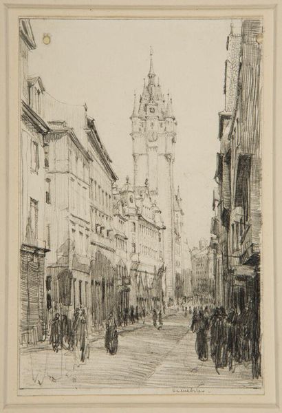 Curator: Samuel Prout's "Prague," held here at the Harvard Art Museums, presents a stunning vista. It's rendered in delicate lines and shades, emphasizing the city's architectural grandeur. Editor: Immediately, I’m struck by the sheer verticality and density of the composition. The eye is propelled upwards by the soaring cathedral tower. Curator: Notice how Prout uses the cathedral not just as a building, but as a symbol. It dominates the scene, a constant reminder of spiritual and cultural weight in urban life. Editor: Structurally, the lines are so meticulous, almost etching-like, which contrasts beautifully with the soft, diffused light across the facade. It gives the stone a palpable texture. Curator: These imposing structures evoke centuries of history and the constant presence of power, both secular and religious. Prout reminds us that cities aren't just physical spaces. Editor: Indeed. The artist's choice to render it in monochrome enhances that timeless feeling, a step removed from the immediate present. Curator: Prout allows us to consider Prague as a repository of memories, a place where time itself seems to echo through the stones. Editor: A masterclass in observation and restraint, highlighting the innate beauty of form.