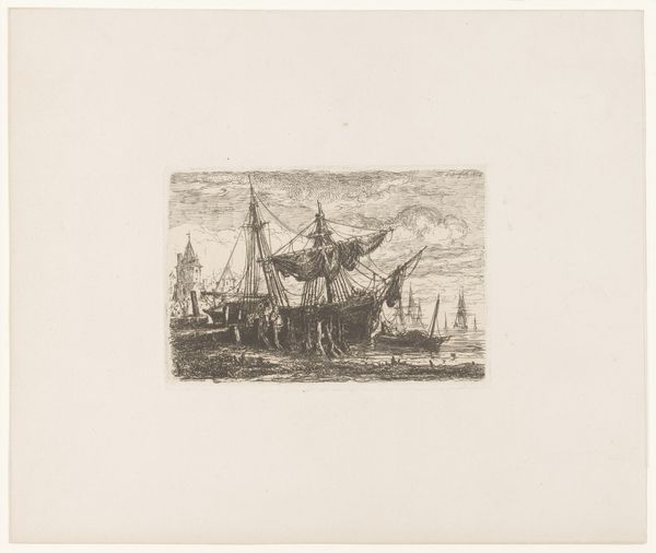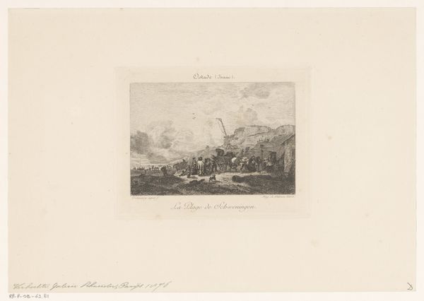 Johann Leonhard Raab made this print, "Drinkend paard aan de waterkant," at an unknown date using an etching technique. It depicts horses and riders at the water's edge in a coastal landscape. Made in 19th century Germany, this image evokes the period's fascination with nature and the romantic idealization of rural life. The detailed rendering of the horses suggests an interest in animal anatomy, a common theme in academic art of the time. The work also hints at the importance of horses in 19th-century transportation and agriculture. Prints like these often circulated as reproductions, making art accessible to a broader audience beyond the traditional art institutions. Analysing Raab's etching in its historical context, using sources such as period journals, exhibition catalogues, and economic data, helps us understand its role in shaping contemporary perceptions of nature and rural life.