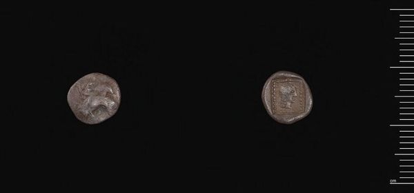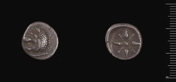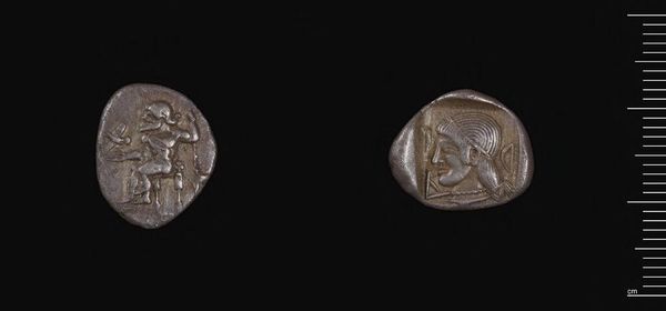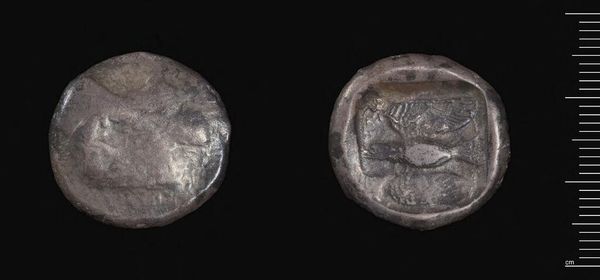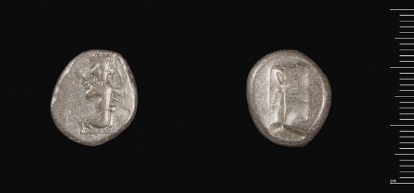 Editor: Here we have a Countermarked Persian Siglos, likely crafted under the Achaemenid Kings. It’s a small, silver coin. I find it fascinating how such a seemingly simple object can carry so much history. What strikes you most about its design and materiality? Curator: Observe the deliberate circular form, its obverse and reverse distinctly articulated. Note the countermarks disrupting the original surface; these alterations, though small, reveal layers of meaning. How do these secondary markings affect the overall composition? Editor: They seem to add texture and complexity, almost like a story etched onto the surface. It’s not just a coin anymore; it’s a record. Curator: Precisely. The incuse impressions and their placement break the initial symmetry, creating a dynamic tension. This coin becomes a palimpsest, each layer modifying our perception of the original. Editor: So, it's the interplay of form and alteration that gives it its power? Curator: Indeed. The coin’s value lies not just in its metallic content, but in its disrupted visual language, hinting at power, trade, and the passage of time. Editor: I hadn't considered how much the alterations contribute to its overall impact. Fascinating.