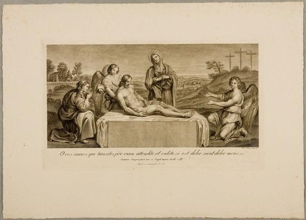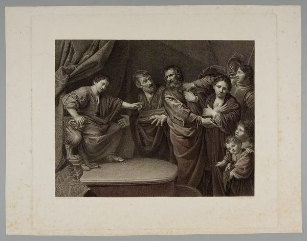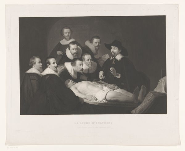 Curator: This is Jan Pieter de Frey's "Anatomic Demonstration," housed here at the Harvard Art Museums. Editor: My initial impression is stark: it is a somber representation of power and knowledge set against the backdrop of mortality. Curator: Observe how the composition directs our gaze. The stark contrast between light and shadow accentuates the central figure, almost dissecting the scene itself. Editor: Yet, this isn't just about visual dynamics. The demonstration, while scientific, occurs in a socio-political context where access to knowledge was heavily policed by class and gender. This image subtly reinforces those hierarchies. Curator: Perhaps, but consider the printmaking technique. The precise lines and tonal gradations achieve a remarkable realism, inviting viewers to engage with the subject matter intellectually. Editor: Yes, and who is invited? Not the poor, not women. They are excluded from this pursuit of knowledge. How does this exclusion shape our understanding of progress and enlightenment? Curator: A powerful point, it is vital to consider how the piece is interpreted, and received, in our present context. Editor: Precisely. Hopefully, it fosters a critical examination of the power structures inherent in the act of observation itself.