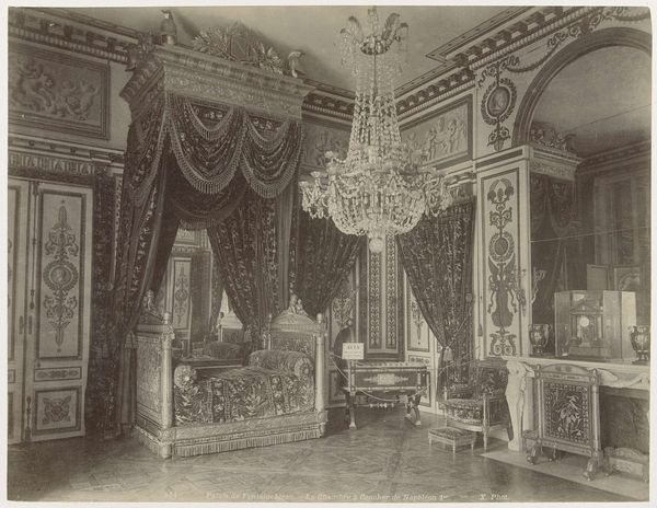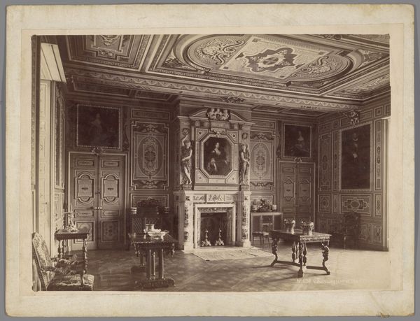Curator: Here we have a photograph titled "Interieur van het Paleis van Fontainebleau," dating from around 1875 to 1900. It's attributed to Mèdèric Mieusement. Editor: My first thought is it’s quite subdued. There's an almost sepia quality. What stands out, though, is this intense layering of detail – the chandeliers, the carved mantelpiece. Curator: Indeed. Mieusement masterfully captures the opulent interior through photography, a medium then gaining prominence. The symmetrical composition draws the eye into the receding space, accentuating the palace's grandeur. Consider the tonal gradations. How do they influence the viewer's perception of volume and light? Editor: I’m thinking, the muted tones give it an almost dreamlike quality, right? I find it oddly melancholy, as though we are intruding upon a scene from the past. The architecture feels more lively than one might expect given its scale – as if the walls are breathing. But where are the people? Does that emptiness say something? Curator: A brilliant observation. The absence of human figures is a conscious choice, directing our focus towards the setting itself – it becomes a stage absent the actors. The textures within the image are quite suggestive; imagine feeling the cold marble under your hand. Editor: And yet, even if the room is empty of people, the space pulses with stories, each carved flourish holding memories and secrets. How differently would we experience the room were we to see figures in conversation? It's intriguing to reflect on this captured silence. Curator: Absolutely. We see how photography can not simply record a space but also offer an interpretation. The rigid lines that define classicism become imbued with personality. It makes me wonder if Mieusement had specific stories of his own he meant to share. Editor: Yes! Seeing this photograph makes one feel very aware of what it chooses to reveal as much as conceal, right? Curator: Well, thinking about this now, that certainly alters my perception. Thanks for pointing me towards those quiet currents humming beneath the image. Editor: Likewise, I appreciate your astute breakdown of its formal qualities – food for thought!