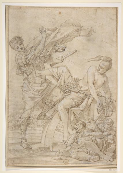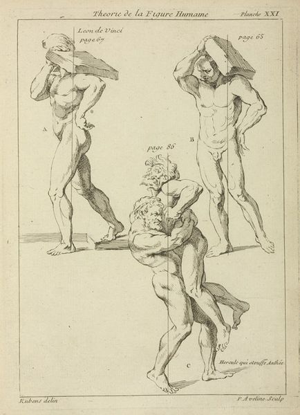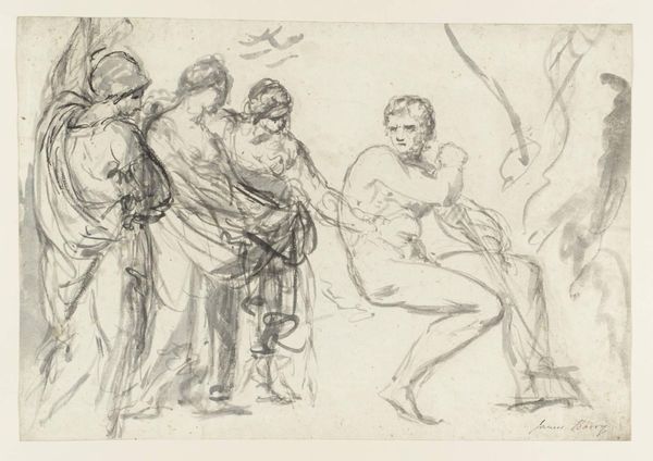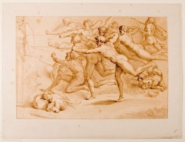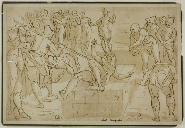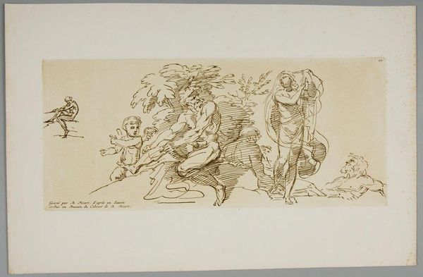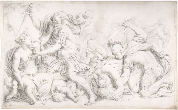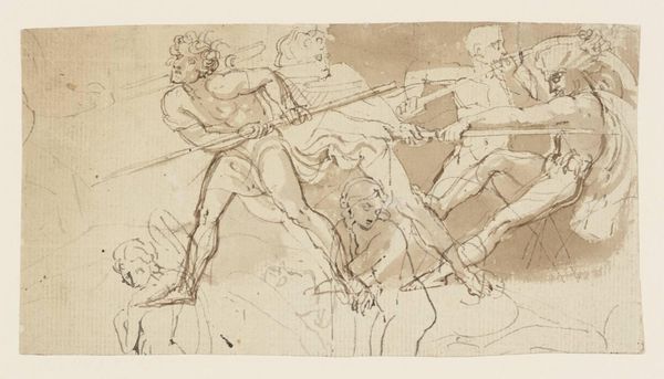 Editor: This print, "Studies for the Painting of The Descent of the Sarrazins at the Port of Ostie," by A. Claude Philippe de Thubières comte de Caylus, feels incredibly dynamic, a flurry of bodies captured in ink. What symbols or historical echoes do you see in this energetic composition? Curator: The Saracens themselves carry a weight of historical memory, often representing the "other" in European consciousness. Note the figures' poses: do they evoke classical depictions of struggle, perhaps echoing scenes of battle or sacrifice? Editor: That's interesting! The classical poses lend the scene a sense of timeless conflict. Thank you for pointing that out. Curator: The symbols and the poses give the image a visual vocabulary that can resonate across time, recalling earlier conflicts.