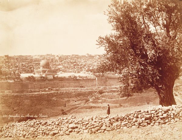 Félix Bonfils made this albumen print, "Jardin de Gethsemani," sometime in the late 19th century. The photograph depicts the Garden of Gethsemane in Jerusalem, a site of profound religious significance, particularly within Christianity, as the place where Jesus prayed before his crucifixion. Bonfils was part of a wave of 19th-century photographers who captured the Middle East, often catering to European and American audiences interested in biblical landscapes and exotic locales. The image creates meaning through its visual codes, presenting an orderly, almost picturesque view of a place laden with religious meaning. It's worth considering how the act of photographing such a site, framing it for Western consumption, relates to broader colonial and orientalist dynamics of the time. Understanding the image requires considering the politics of imagery and how cultural and religious sites are represented and consumed. Further research into the market for such photographs and the social conditions that shaped Bonfils's work can deepen our understanding of its place in history.