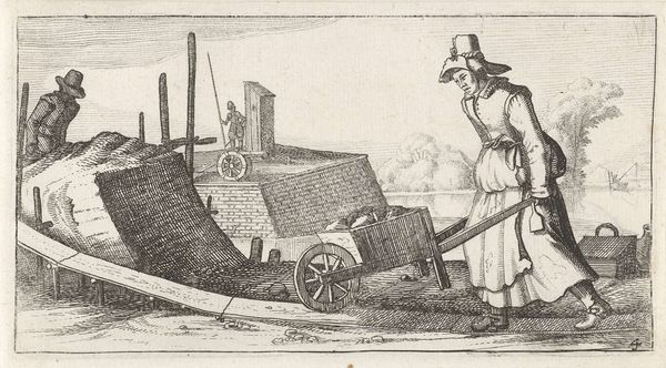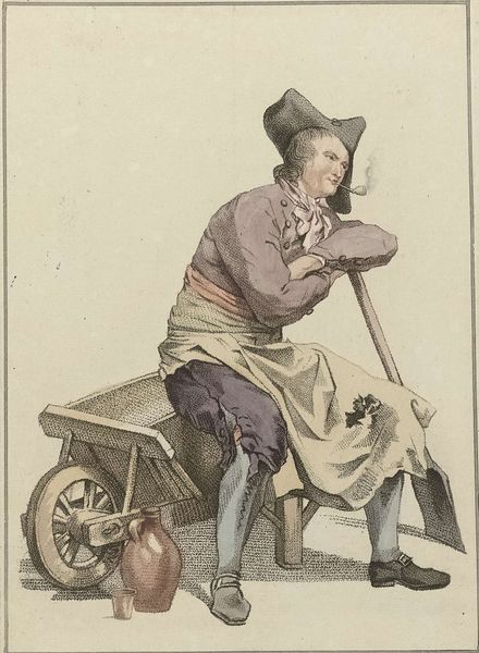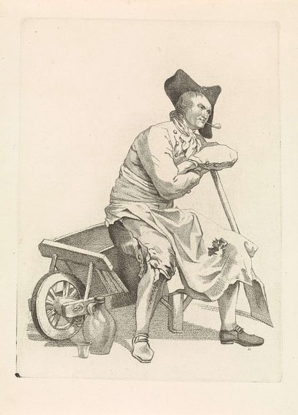 Editor: So, we're looking at "Man met kruiwagen"—"Man with Wheelbarrow"— by Mathias de Sallieth, dating somewhere between 1772 and 1833. It's a pencil drawing, and what strikes me most is how detailed the wheelbarrow itself is compared to the somewhat caricatured man. What jumps out at you? Curator: The tension between the rough sketch of the man and the relatively precise rendering of the wheelbarrow speaks volumes about labor and class during that period. We see here the tools of production arguably given more "attention" than the human driving the production itself. Notice the subtle detail in the wood grain and construction. Who built this wheelbarrow, and under what conditions was it sold to or provided for the working man? Editor: That's a perspective I hadn't considered. So, you're suggesting the artist is making a commentary on the value, or lack thereof, placed on laborers versus their tools? Curator: Precisely. The sketch prioritizes the *means* of labor over the person doing the work. The medium, pencil on paper, is relatively inexpensive, hinting perhaps at art being more accessible, more 'common,' and potentially reflecting the subject matter. Do you notice how the rendering emphasizes the physicality of the wheelbarrow: it is very detailed to look like the real thing? This suggests where value lies in the image. How does it challenge traditional fine art subject matter? Editor: I see what you mean! Traditional portraits often celebrated the wealthy or powerful. This seems to democratize art by focusing on the everyday experience and, honestly, the materials that defined that experience. Curator: Exactly. It prompts us to consider not just the image, but the entire system of production that makes both the wheelbarrow *and* the artwork possible. Editor: That's fascinating. I’ll definitely look at other pieces through this lens of materials and their implications. Curator: Indeed, recognizing the significance of artistic creation and labor transforms the way we view art!